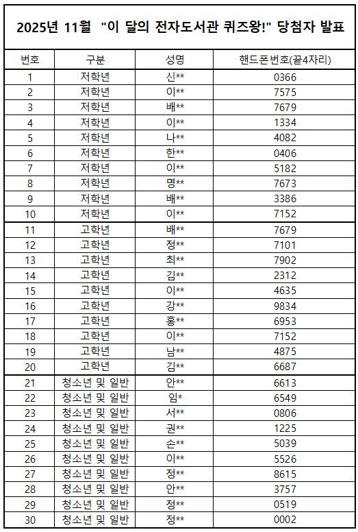 11월 이달의 전자도서관 퀴즈왕! 당첨자 발표