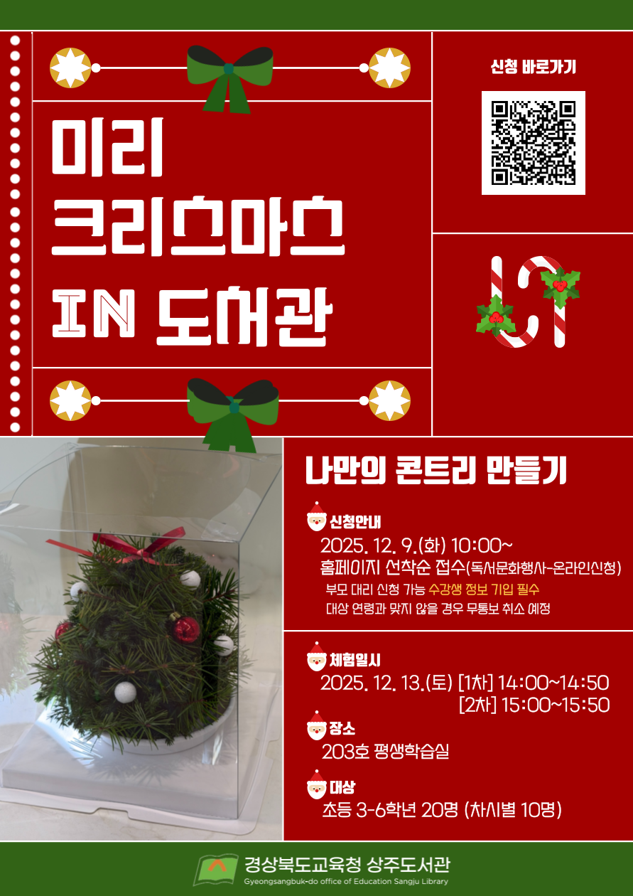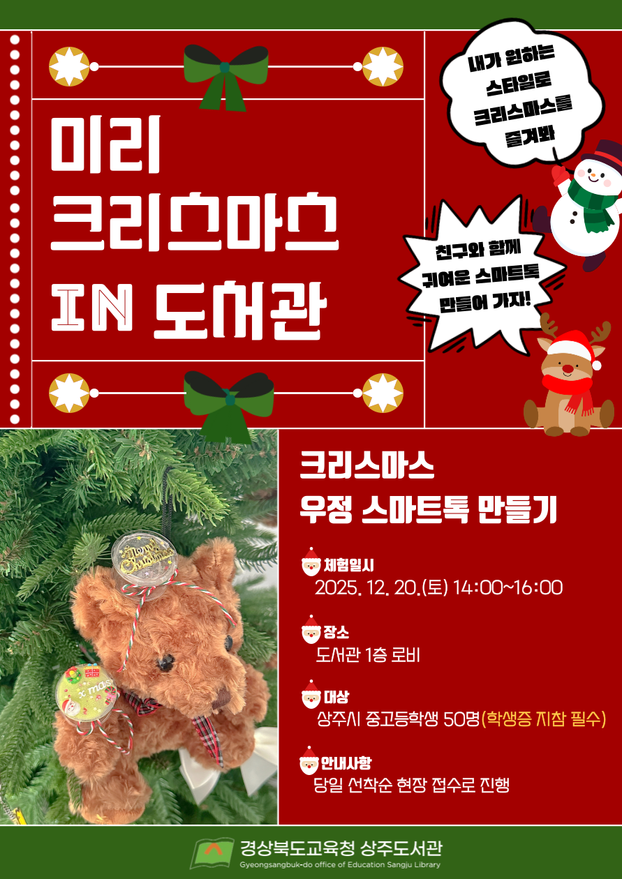 🎄신청일시: 25. 12. 9.(화) 10:00~ 🎄신청방법: 홈페이지 선착순 접수 [신청바로가기] 부모 대리 신청 가능 / 참여자 정보 기입 필수 대상 연령과 다를 경우 무통보 취소 예정 중복 신청 불가 🎄체험일시: 25. 12. 13.(토) [1차] 14:00~14:50 [2차] 15:00~15:50 🎄대상: 초등 3-6학년 20명(차시별 10명) 🎄장소: 203호 평생학습실 | 🎄체험일시: 25. 12. 20.(토) 14:00~16:00 🎄대상: 상주시 중고등학생 50명(학생증 지참 필수) 🎄장소: 도서관 1층 로비 🎄운영방식: 당일 선착순 현장 접수로 진행 |