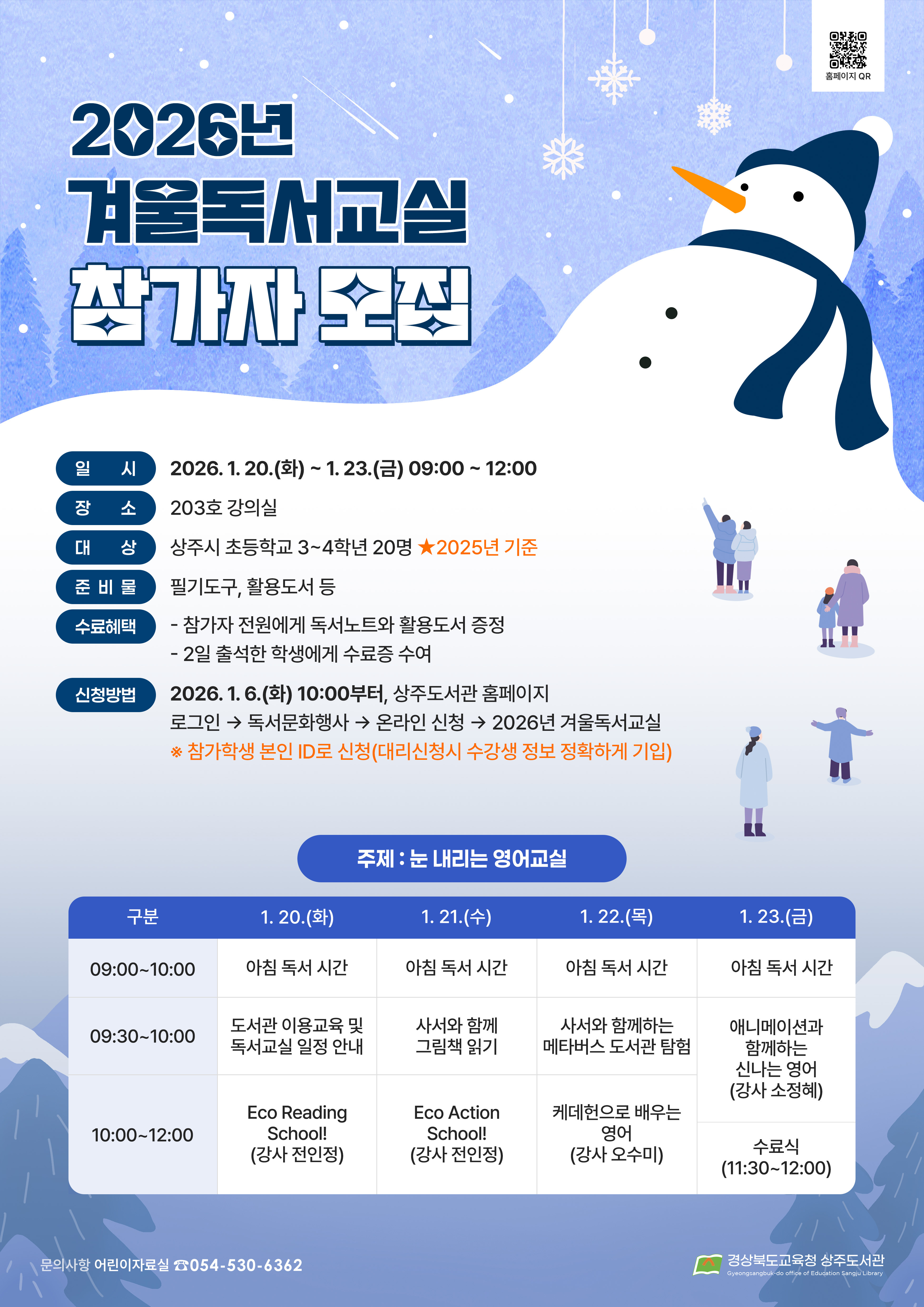 📢일시: 2026. 1. 20.(화)~1. 23.(금) 9:00~12:00📢대상: 2025년 기준 초등학생 3~4학년 20명[2015~2016년생]