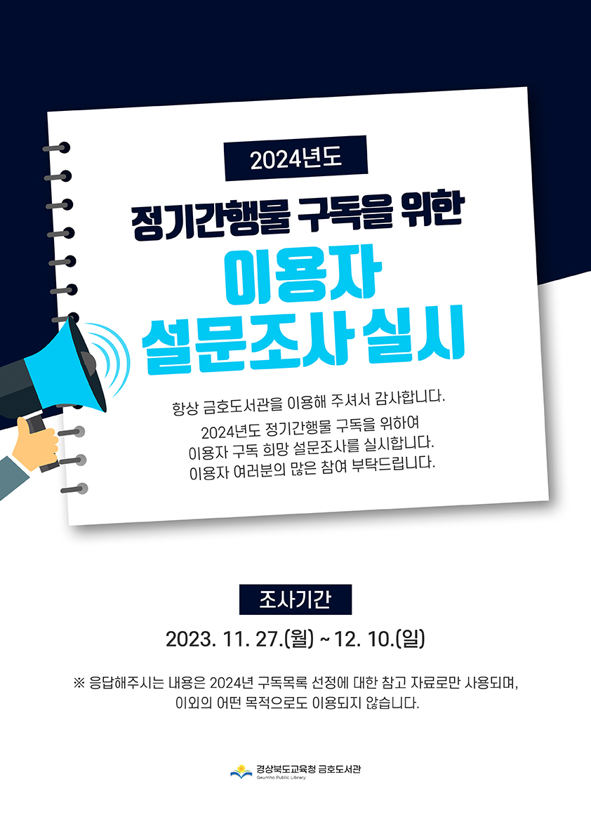2024년 정기간행물 선정을 위하여 이용자 설문조사를 실시합니다.
