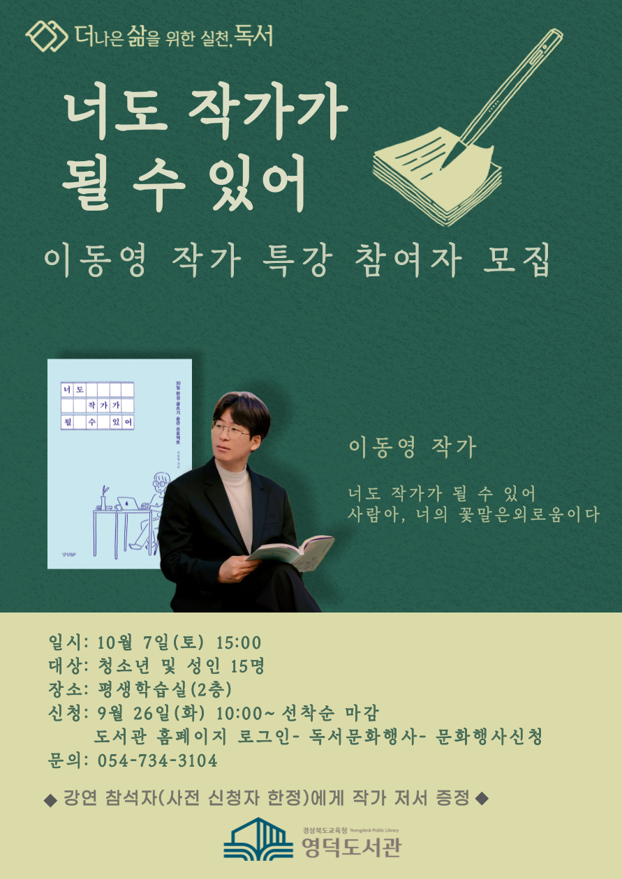 2023년 「더 나은 삶을 위한 실천, 독서」 이동영 작가 특강 참여자 모집 안내