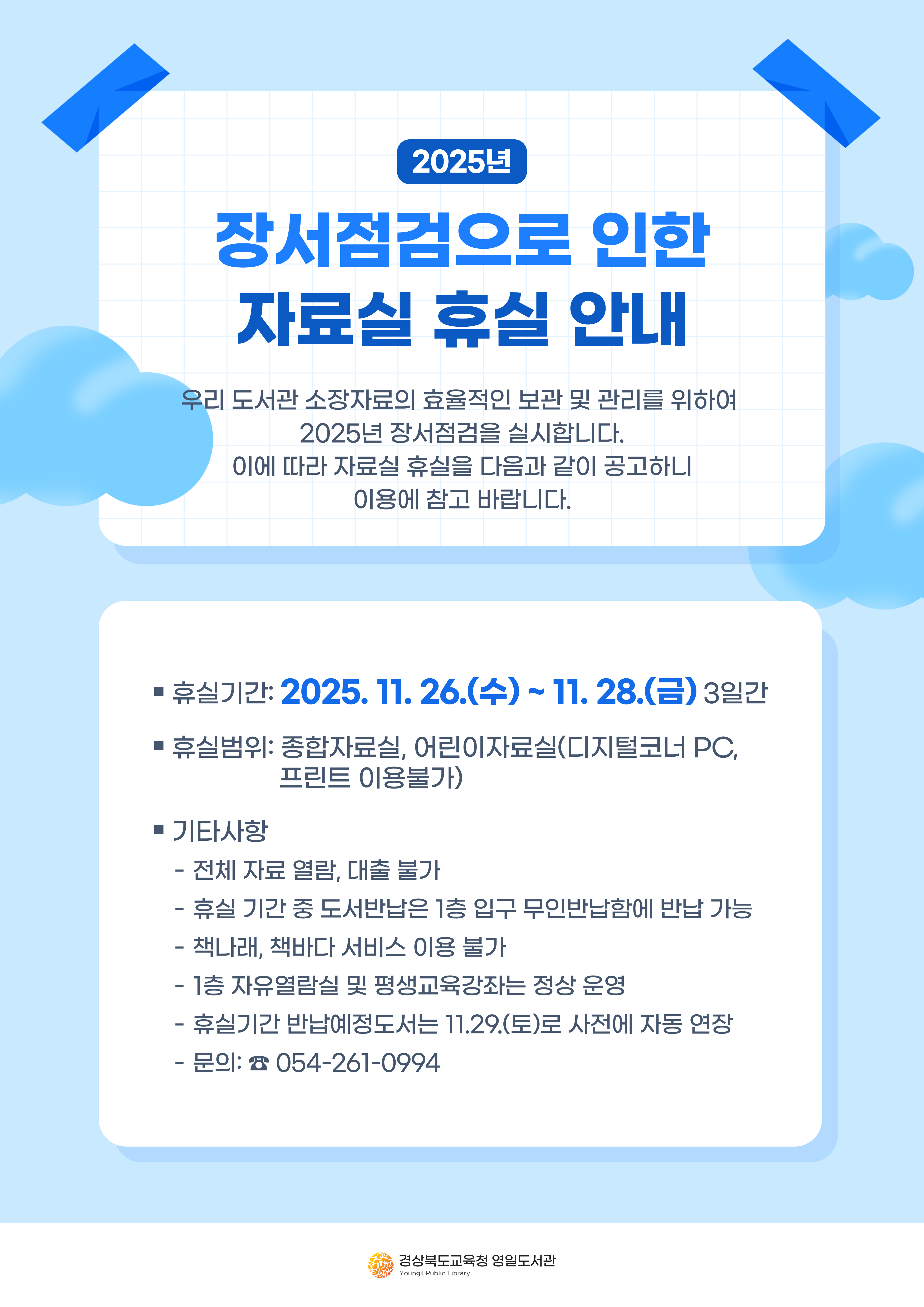 2025년 장서점검으로 인한 자료실 휴실 안내(11.26.~11.28.)