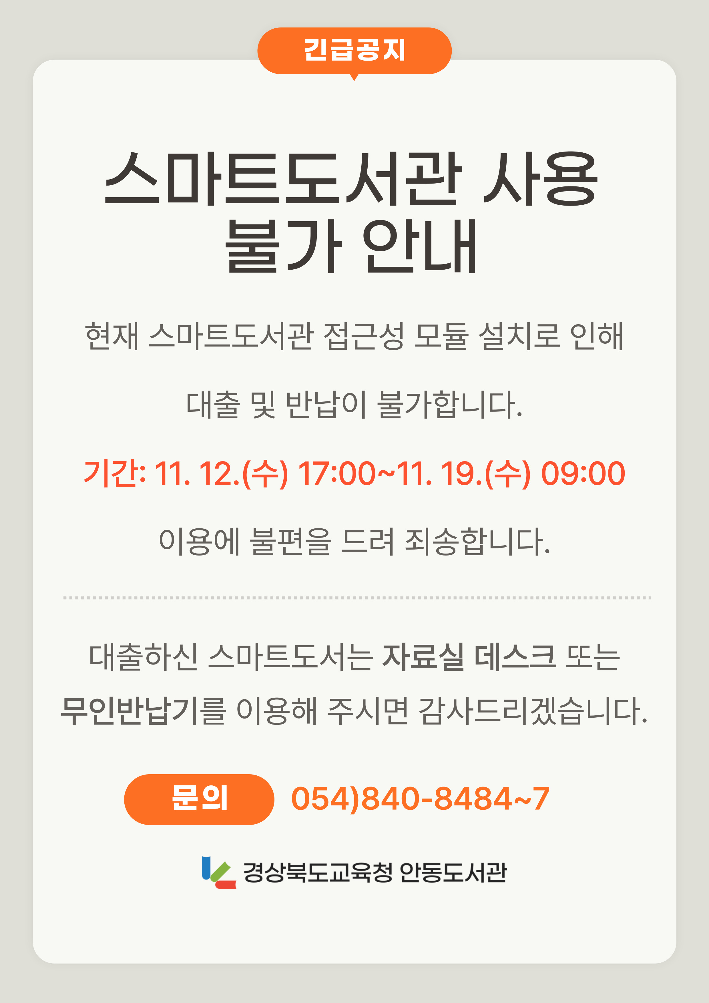 - 스마트도서관 접근성 모듈 설치로 인한 이용 중단 안내