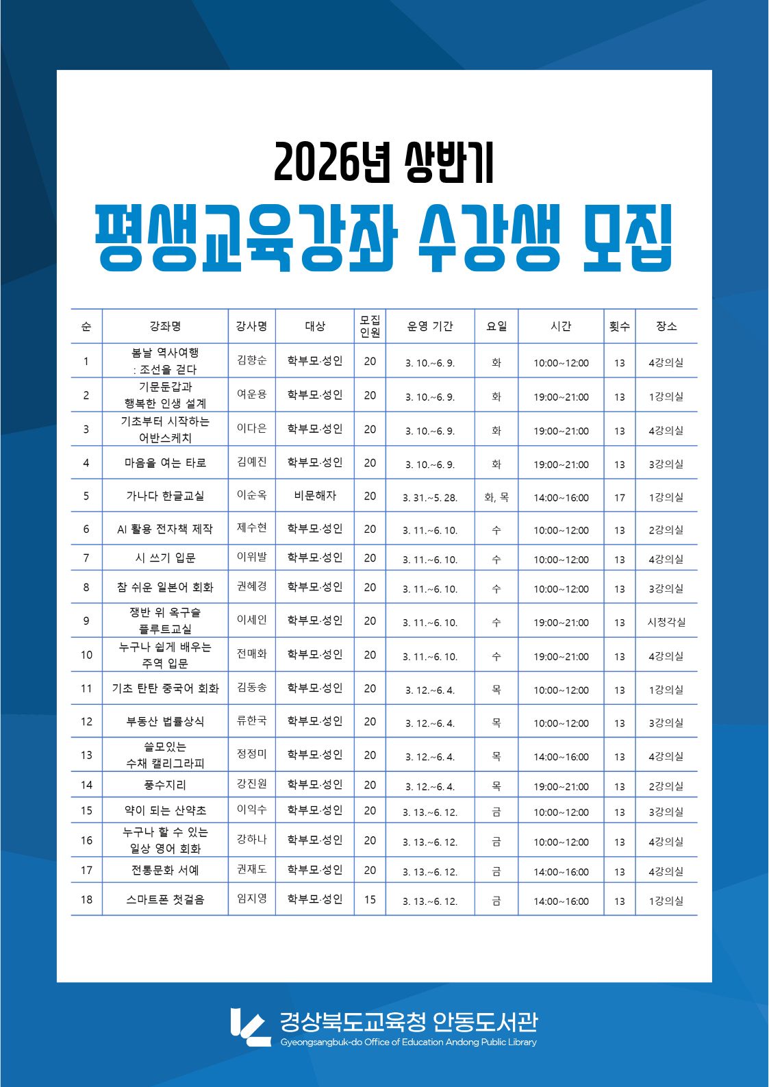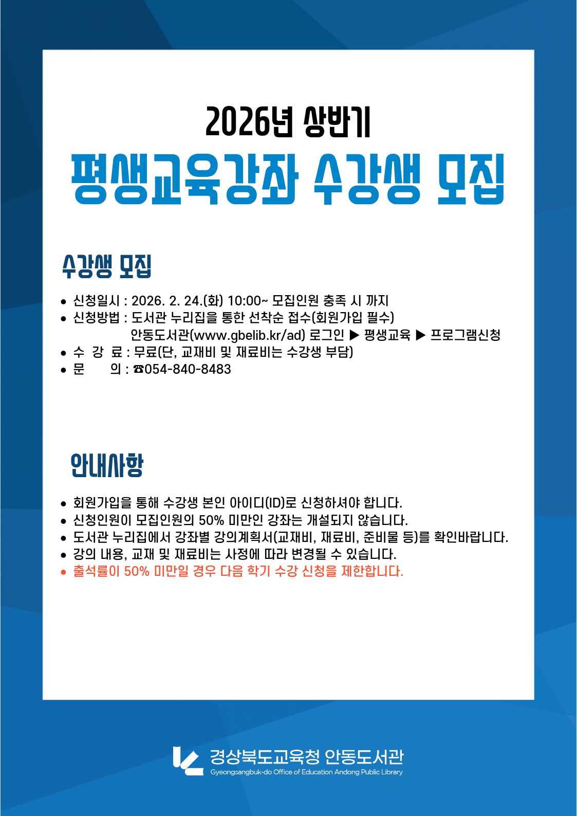 - 2026년 상반기 평생교육강좌 수강생 모집 안내