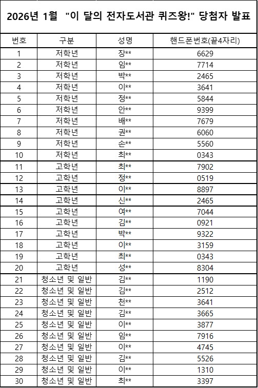 1월 이 달의 전자도서관 퀴즈왕! 당첨자 발표