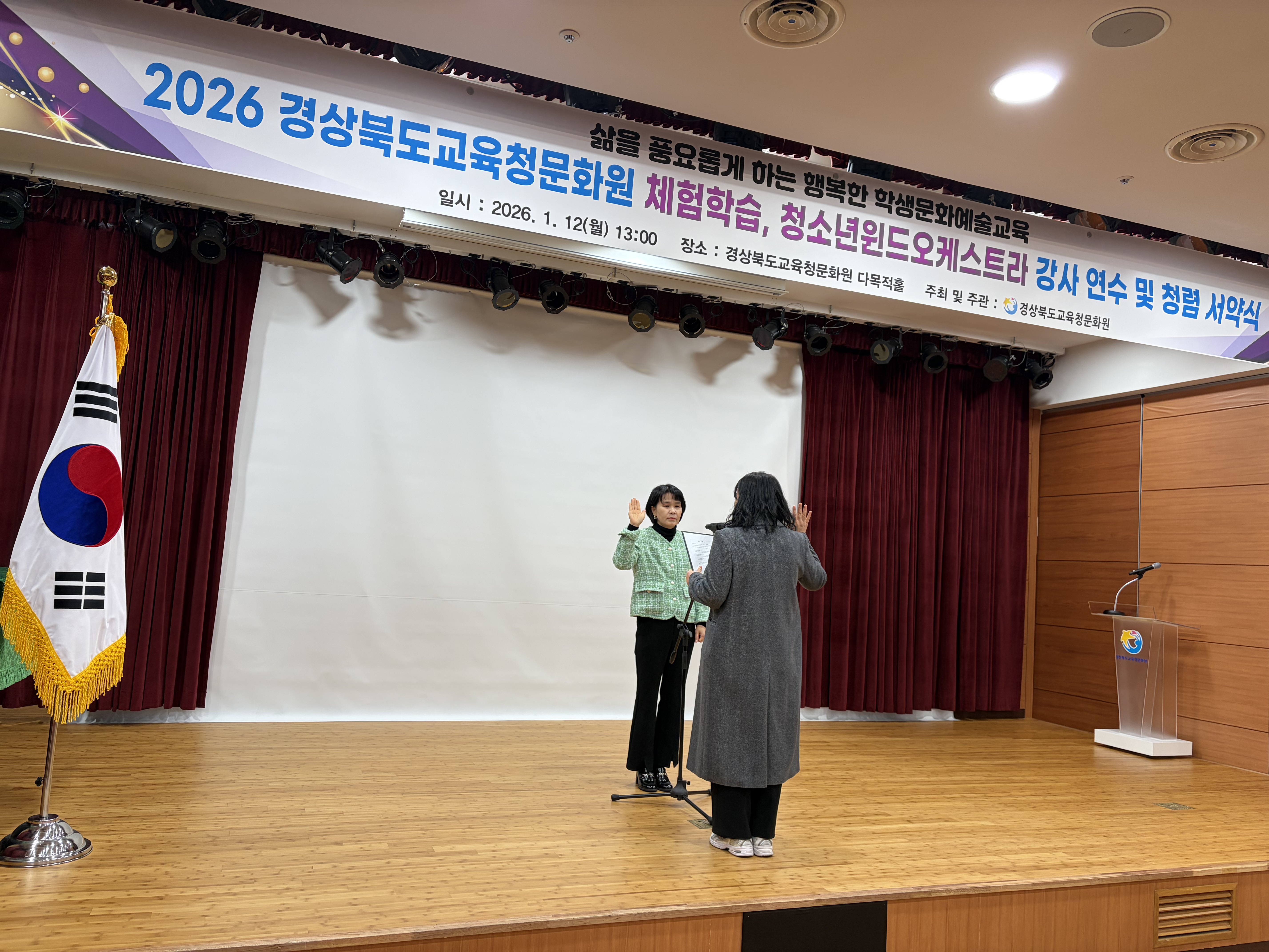 경상북도교육청문화원(원장 박민아)은 1월 12일(월) 2026년 체험프로그램강사 26명, 청소년윈드오케스트라강사 21명을 대상으로 강사 연수 및 청렴 서약식을 실시하였다.