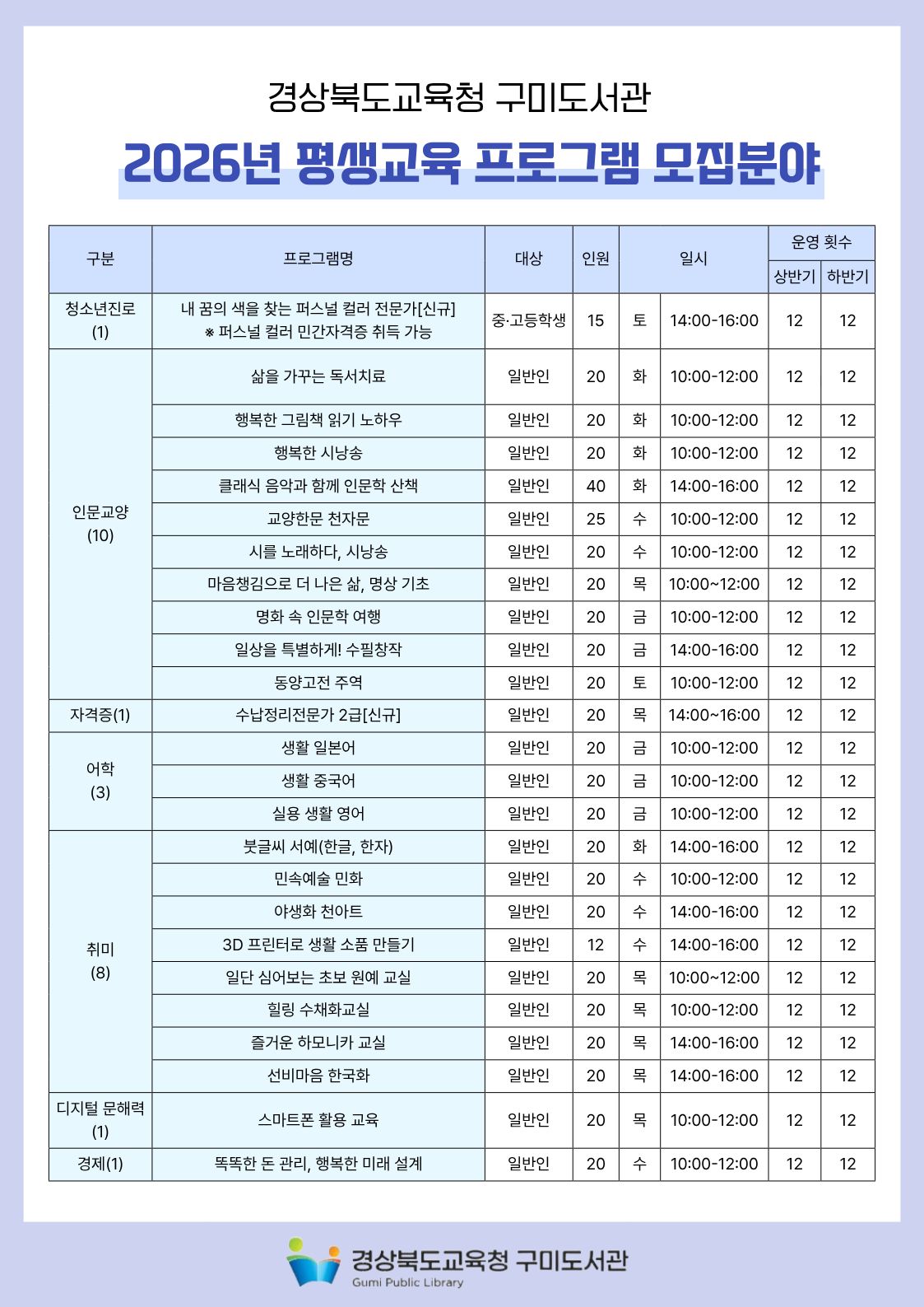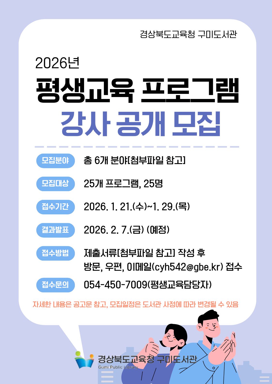 2026년도 경상북도교육청 구미도서관 평생교육 프로그램 강사 공개 모집 공고