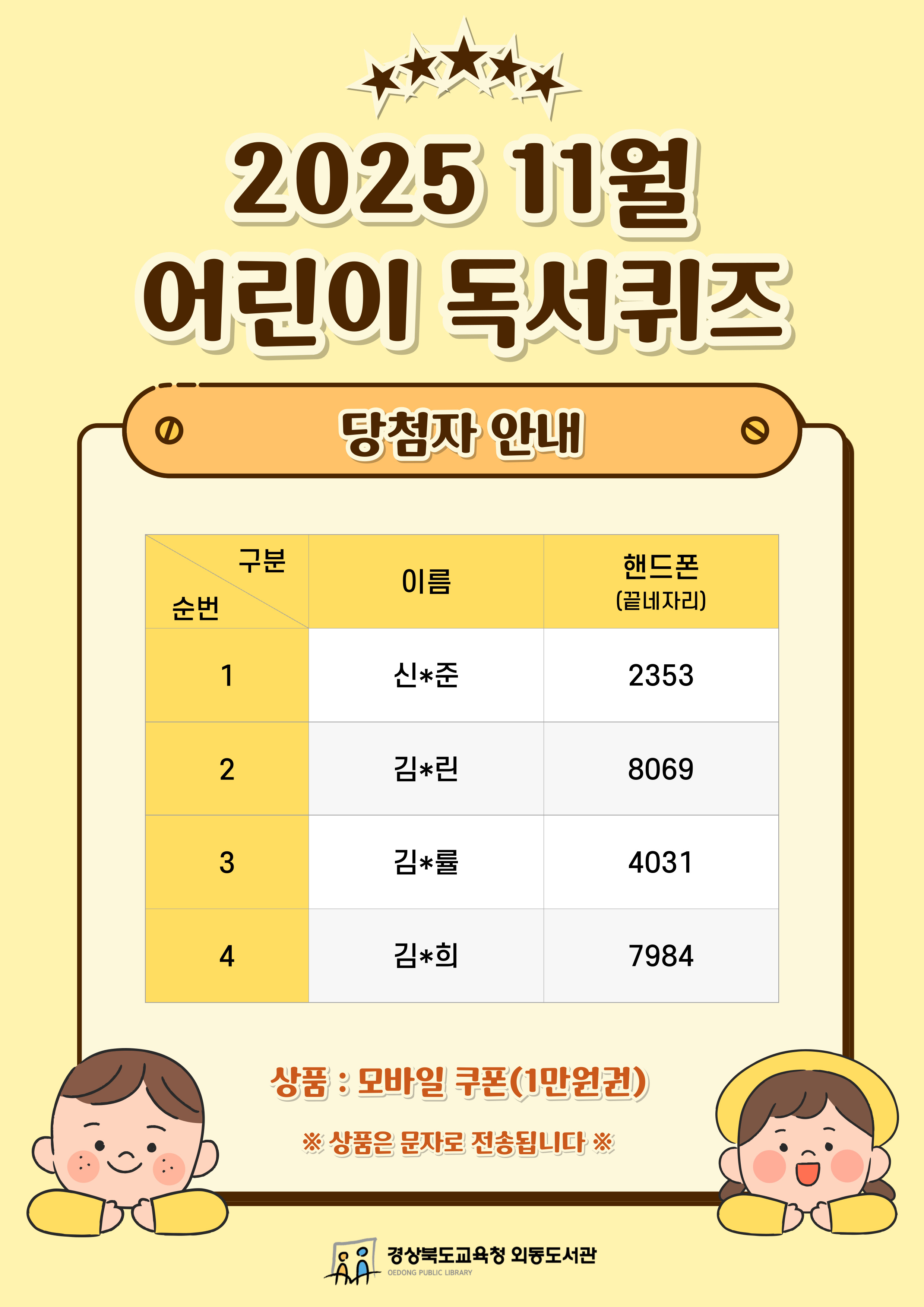 2025년 11월 어린이 독서퀴즈 당첨자 안내