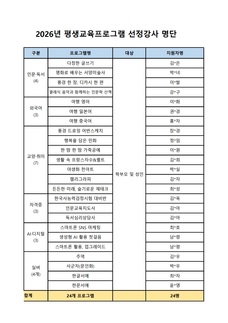2026년 평생교육프로그램 선정 강사 안내드립니다.