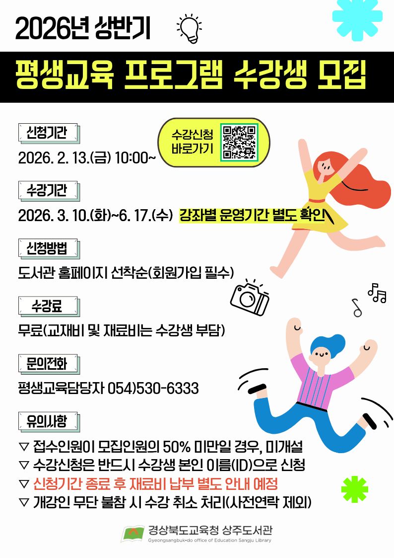 | 이전글 | [알림] 2026년 평생교육강사 선정 결과 알림 | 상주도서관 | |