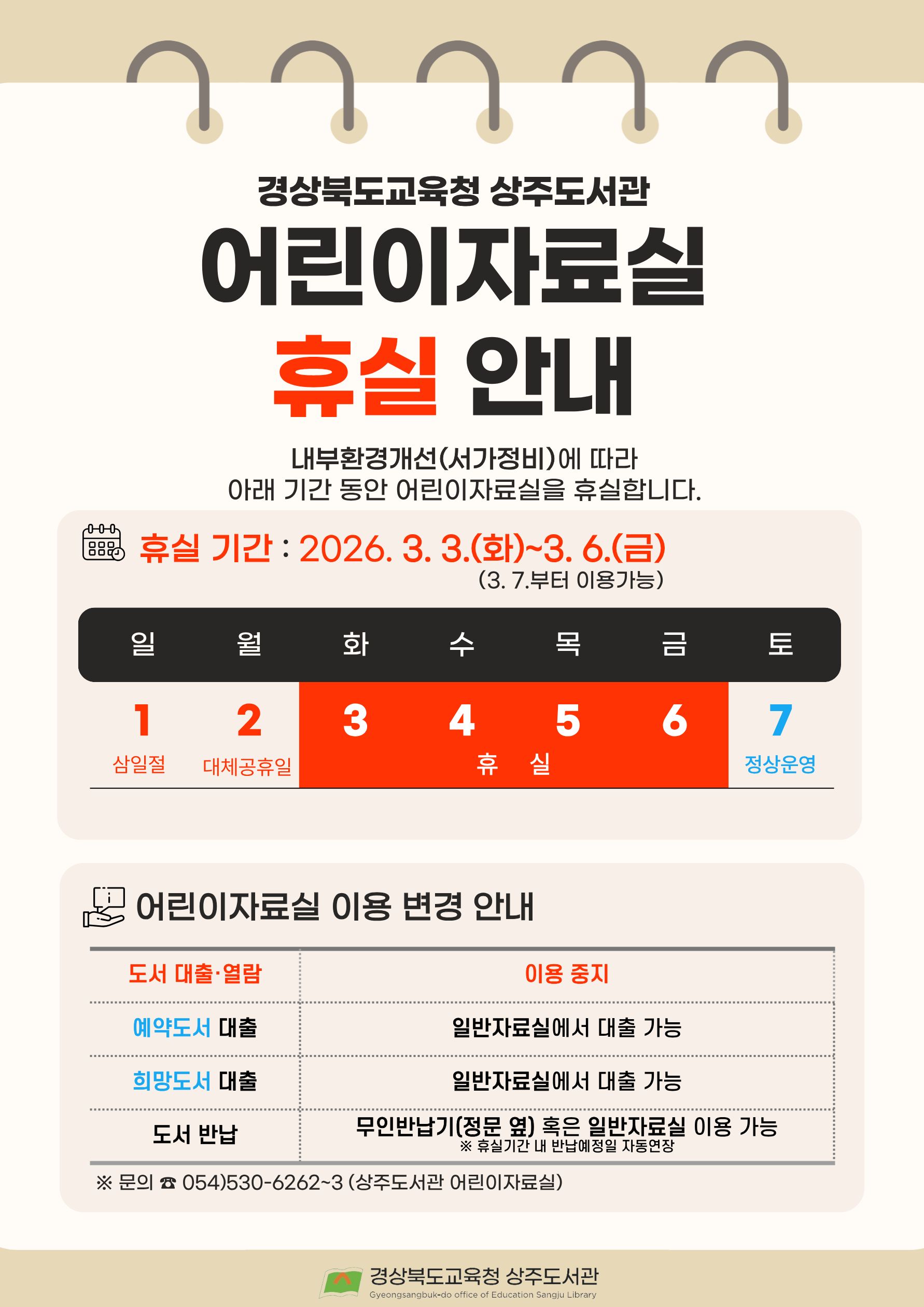 어린이자료실 휴실 안내 (26.3 .3.~3. 6.)