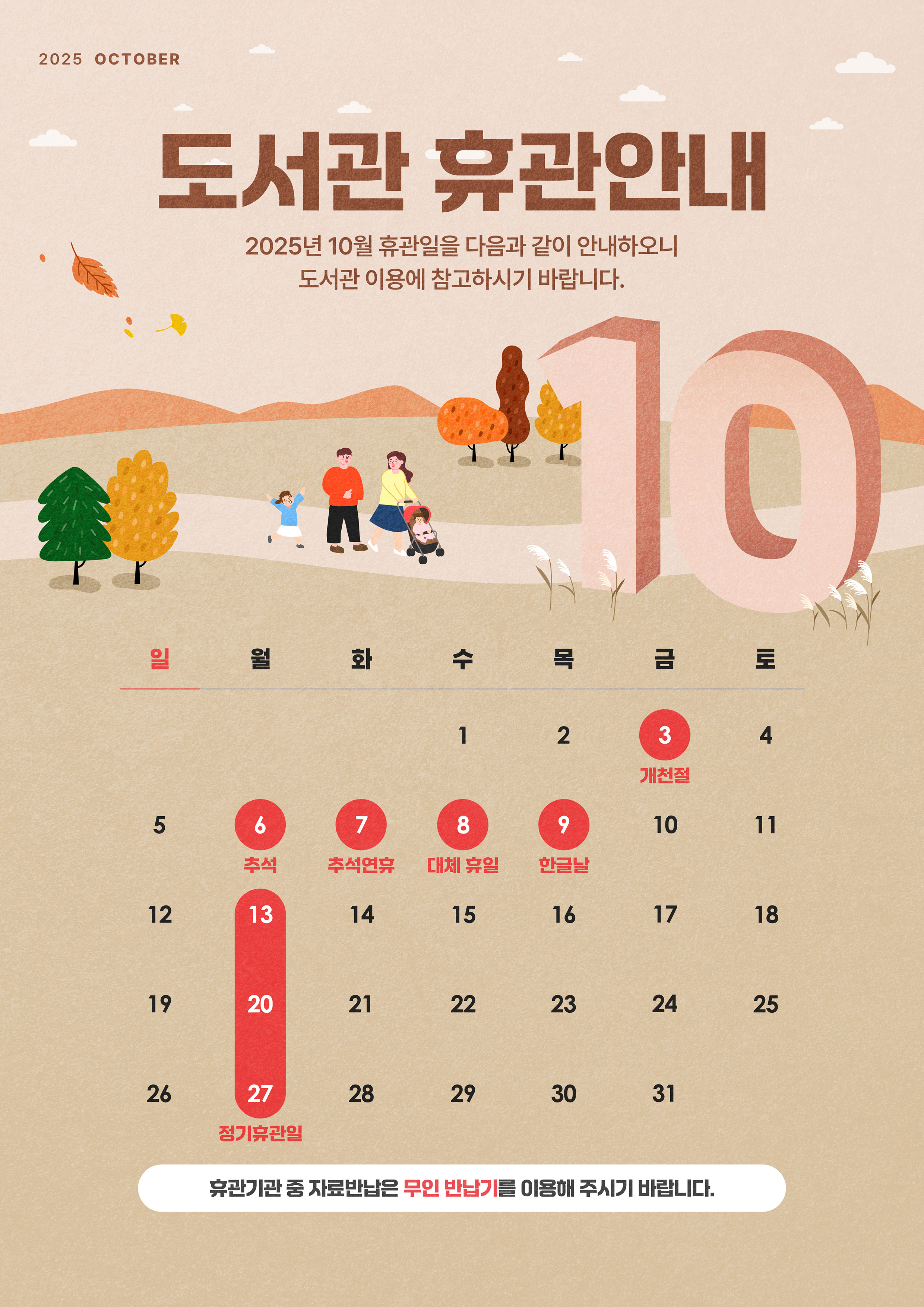 개천절, 한가위, 한글날 등 공휴일이 다수 포진되어 있어요. 공휴일에는 도서관을 개방하지 않으며, 대출기한 또한 그 일수만큼 자동으로 연장되는 점 유의해주세요. 평안하고 풍성한 한가위가 되기를 바라요 🍁 |
