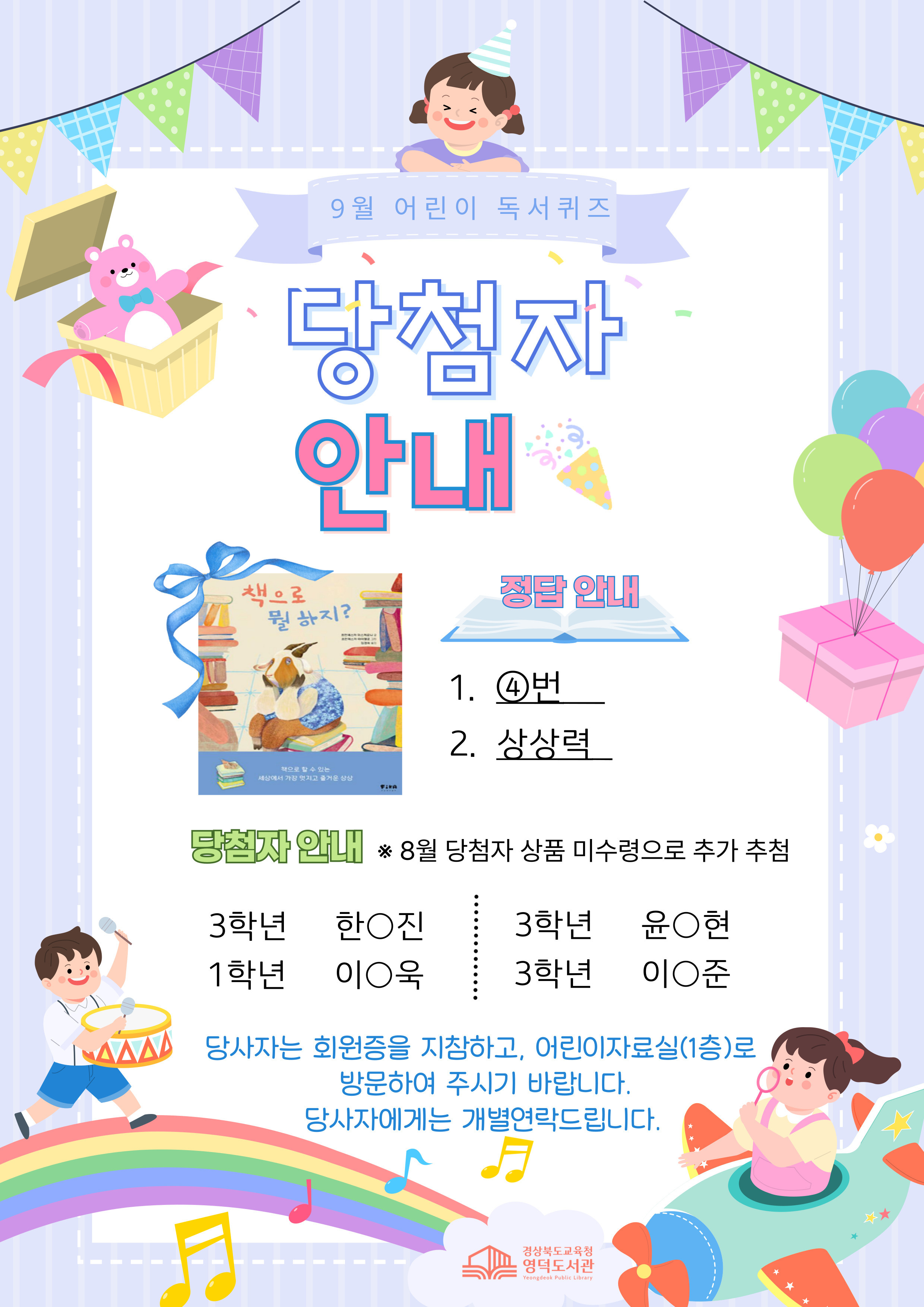 2025년 9월 어린이 독서퀴즈 당첨자 안내