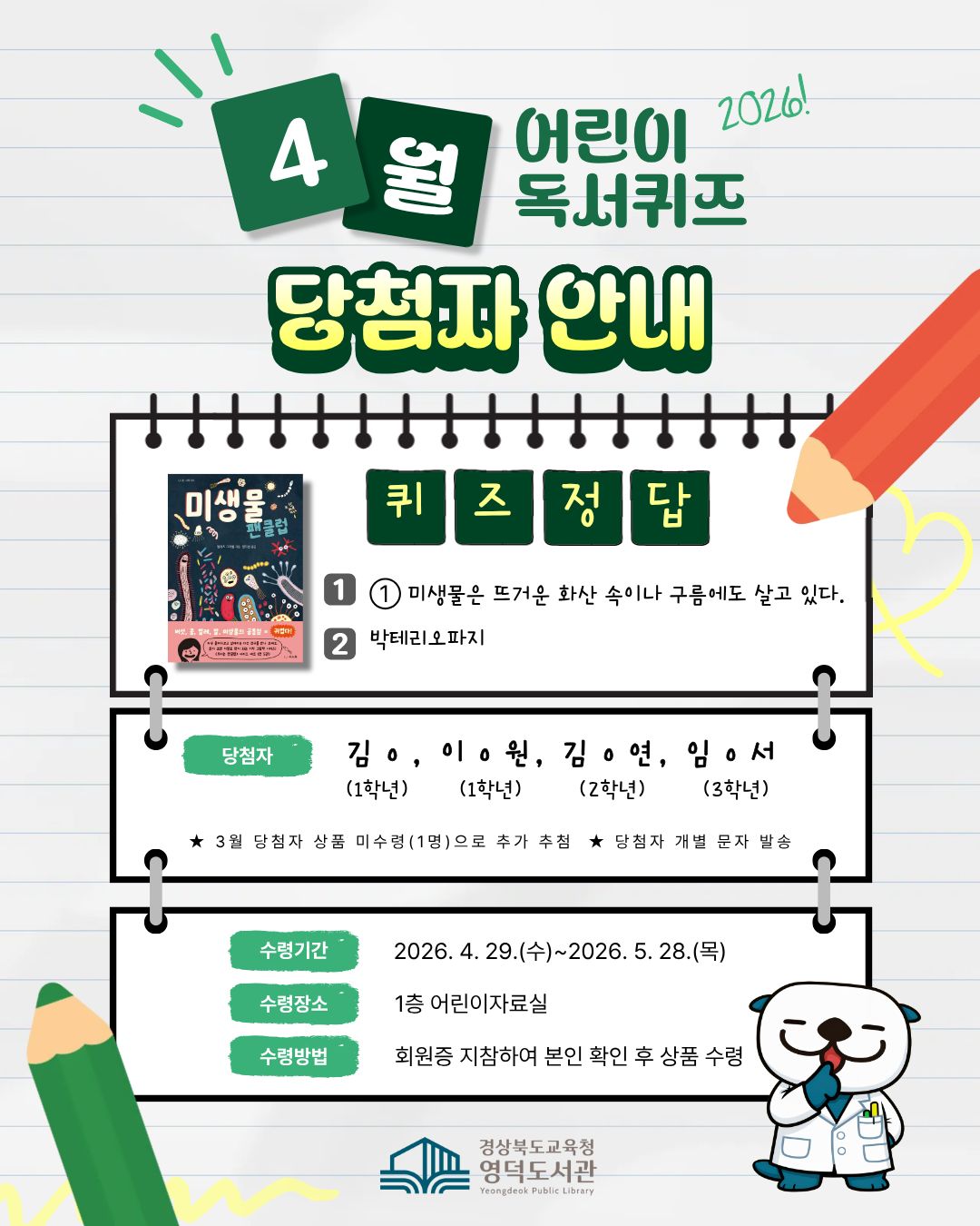 2026년 4월 어린이 독서퀴즈 당첨자 안내