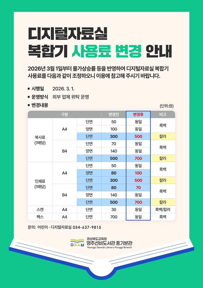 2026년 3월 1일부터 물가상승률 등을 반영하여 디지털자료실 복합기 사용료를 다음과 같이 조정하오니 이용에 참고해 주시기 바랍니다.