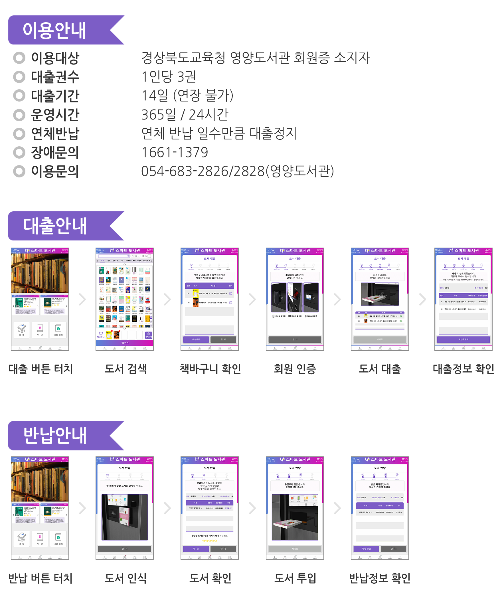 - 스마트도서관 도서는 스마트도서관 기기에서만 반납 가능